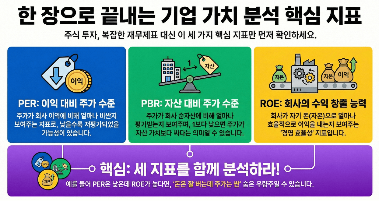 주식 투자를 시작하려 할 때, 수많은 기업과 복잡한 차트 앞에서 어떤 종목을 골라야 할지 막막했던 경험이 있으신가요? 마치 넓은 바다에서 혼자 항해하는 기분일 수 있습니다. 하지만 걱정 마세요. PER, PBR, ROE라는 세 가지 핵심 지표는 이 복잡한 기업의 세계를 이해하는 간단하면서도 강력한 나침반이 되어줄 수 있습니다. 이 세 가지 숫자만 제대로 이해해도 기업의 가치를 판단하는 첫걸음을 성공적으로 뗄 수 있습니다.